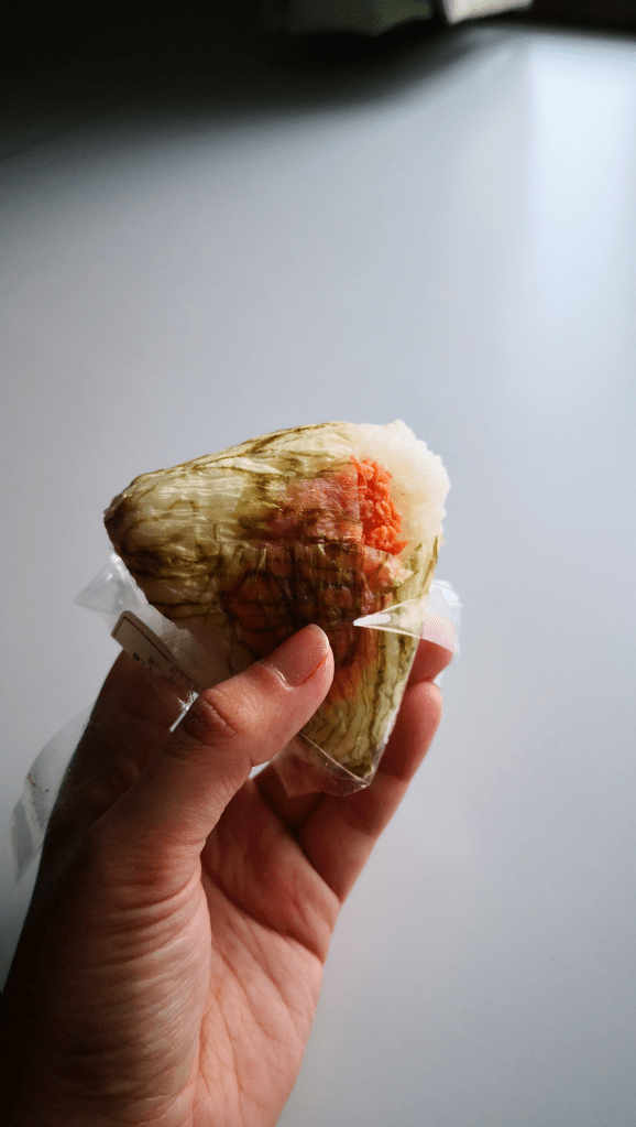 Onigiri is a rice ball, usually with some kind of filling, wrapped up in nori. The filling can range from pickled plums to tuna salad to pork. I got this one from a grocery store near the hotel. It’s stuffed with mildly spicy salmon flakes.