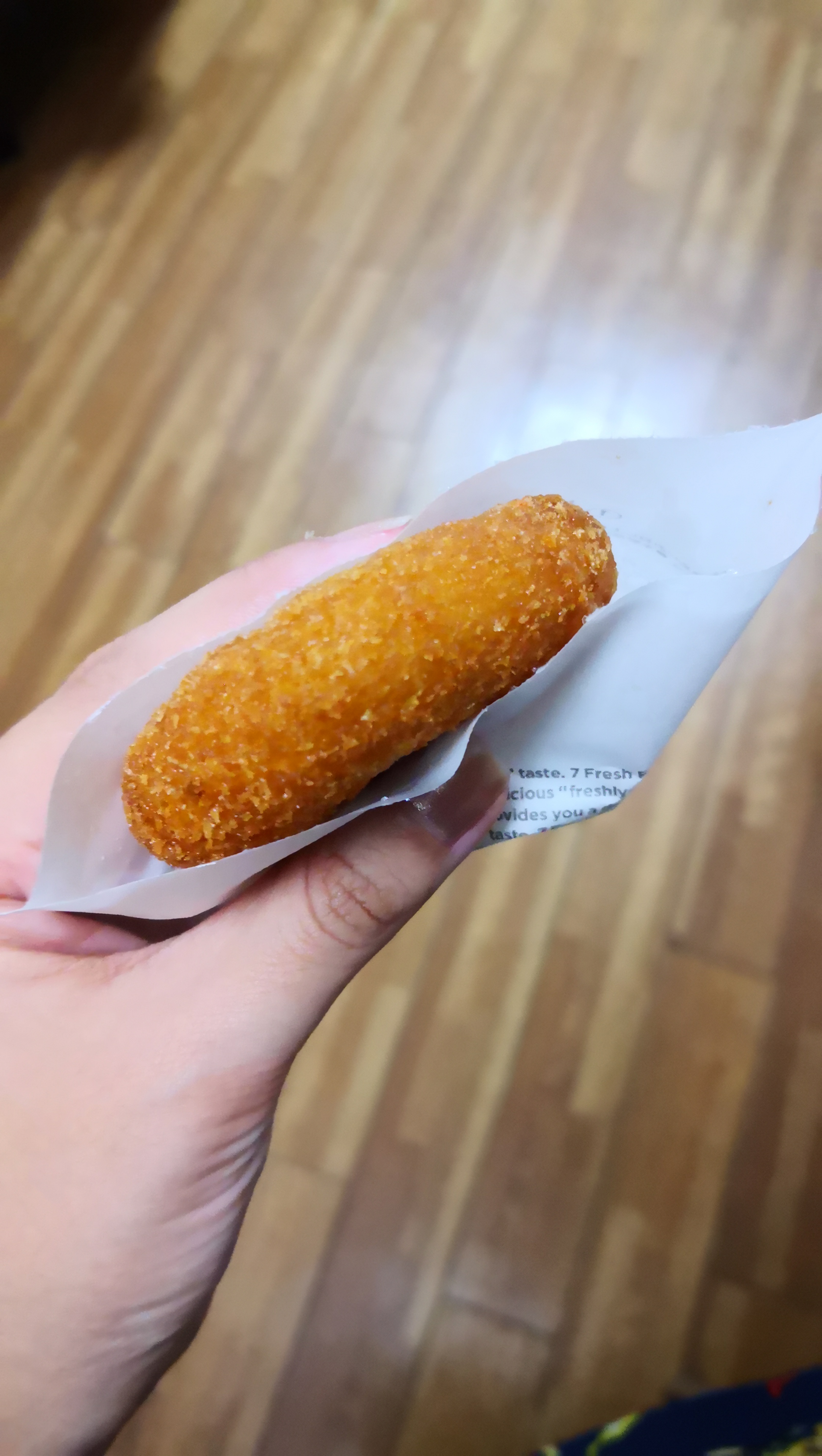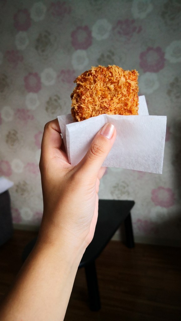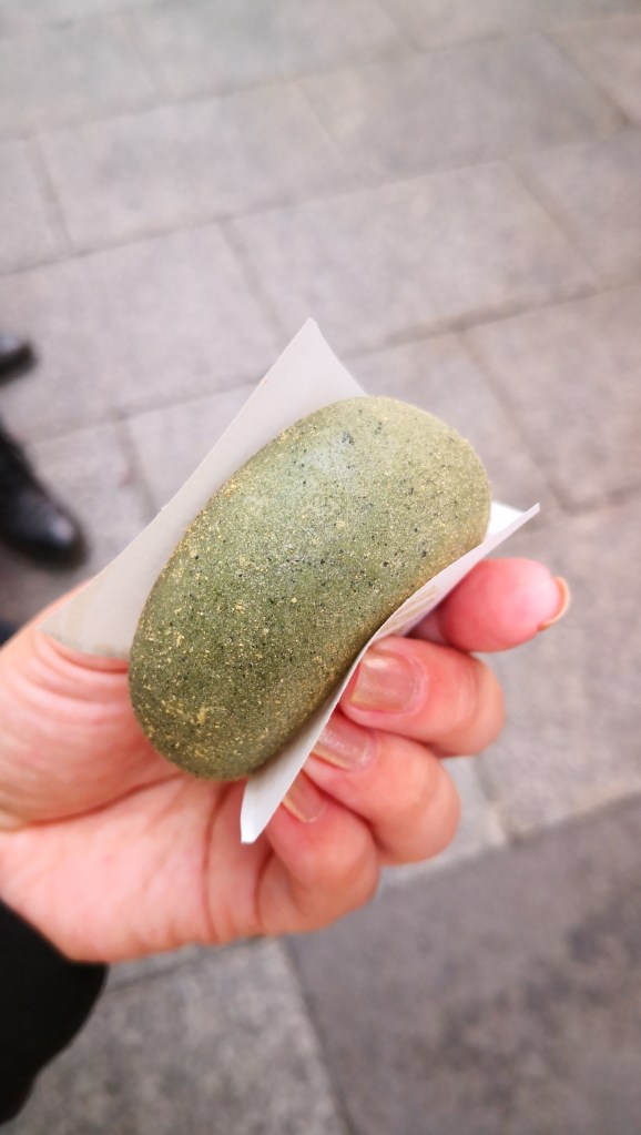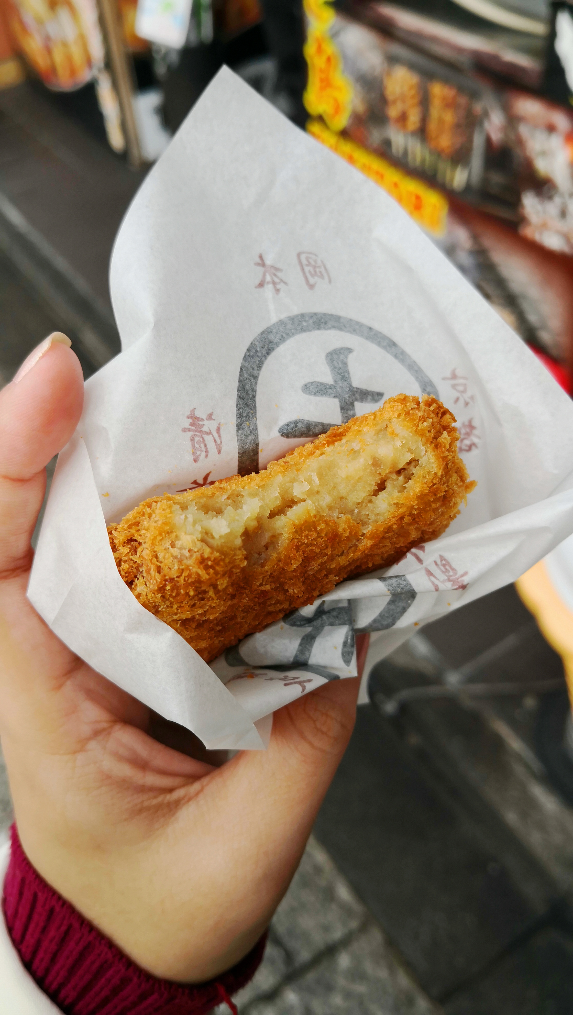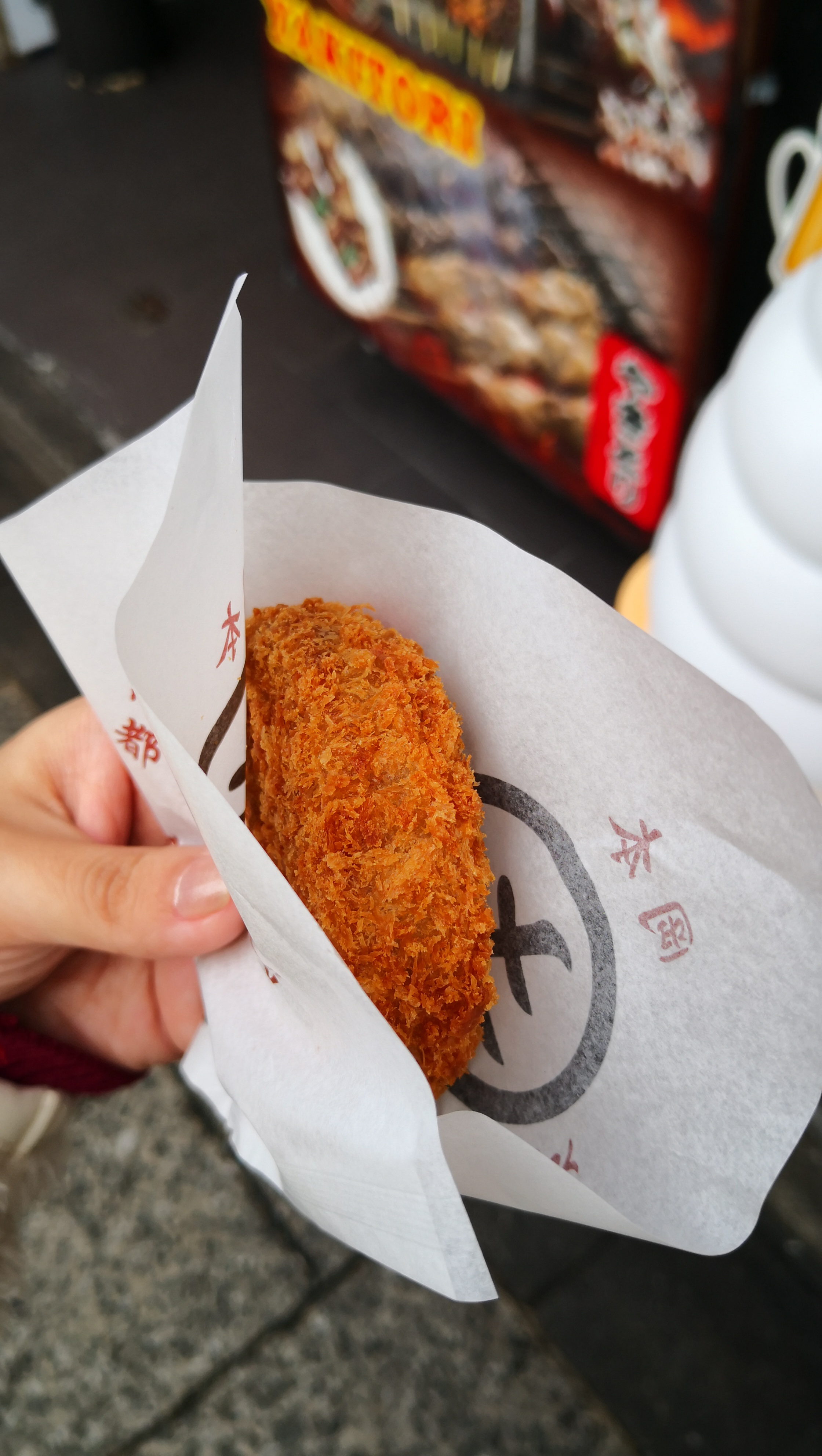 We were walking around Kyoto and passed by a cafe window where croquettes were on display. That’s where I got the plain potato croquette on the left. On the right is a cheese and mushroom (mostly cheese) croquette I got at a food market. They were priced at ¥200 and ¥367 respectively.