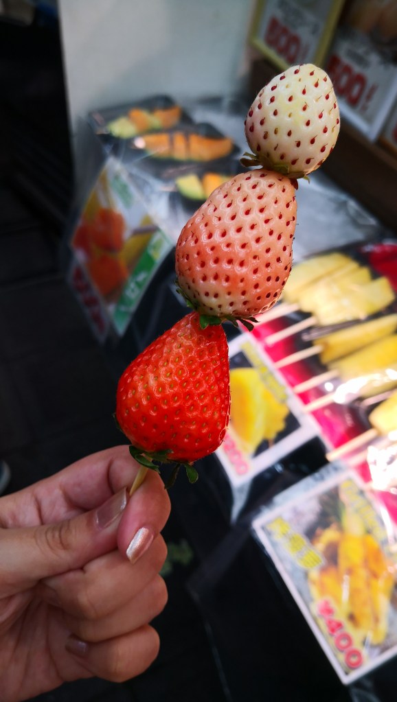 White strawberries need a large space to grow, and only about 10% of strawberries turn out white, which makes them more expensive. The skewer of three strawberries cost me ¥500 (about $4.50 or PHP 234.00). In the US, just one good-sized white strawberry can go for $10. Special breeds like to Kokota strawberry can cost as much as $22.