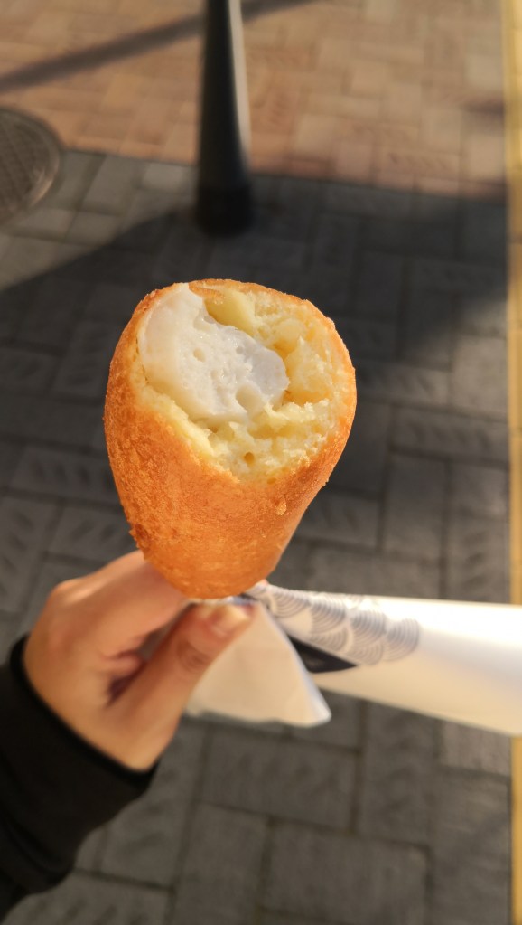 The walk from Himeji Castle to the train station is a long one. Among the wide streets and tall buildings, we saw a bakery of sorts advertising what looked like a corn dog. Upon closer inspection, we saw that it was a kind of crab-and-cheese-stuffed waffle, so we lined up. They cost ¥300 apiece. It was good to have something hot to munch on while we walked in the cold.
