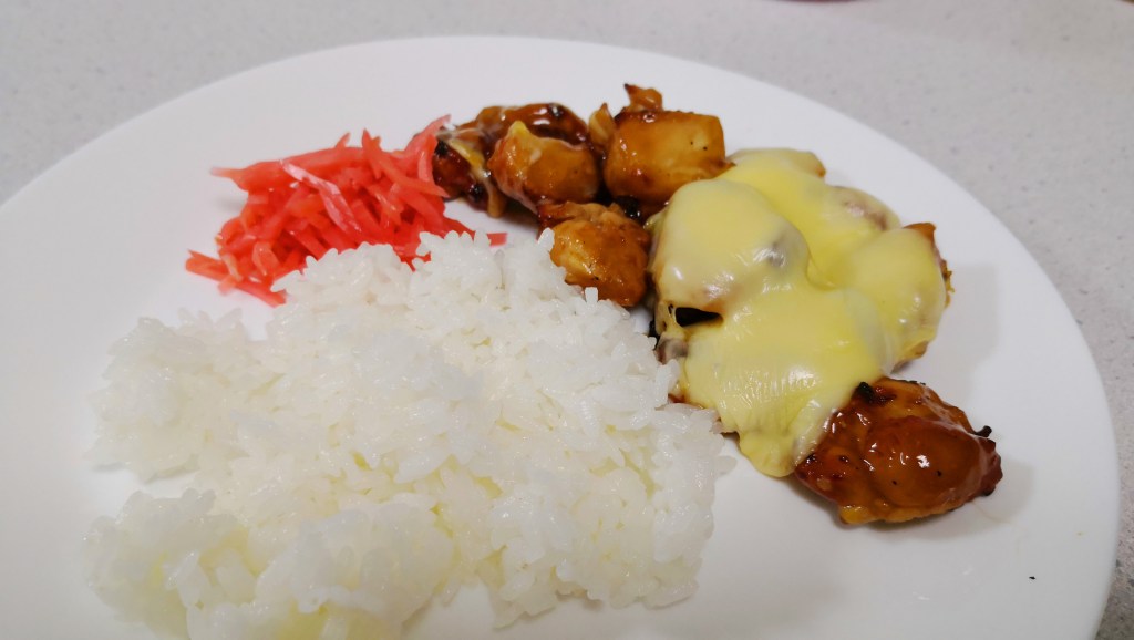 On my last day in Japan, I had done a lot of shopping and packing, and I wanted to have a chill dinner at the AirBNB. I bought all the components at the nearest 7/11 and stuck everything in the microwave. The serving of chicken was already cooked, so I laid it out on the plate and put some cheese slices on top of it. I had it with rice and some pickled ginger on the side to balance out the savory flavor. The whole meal cost less than ¥600 and I still had some leftover ginger and cheese.