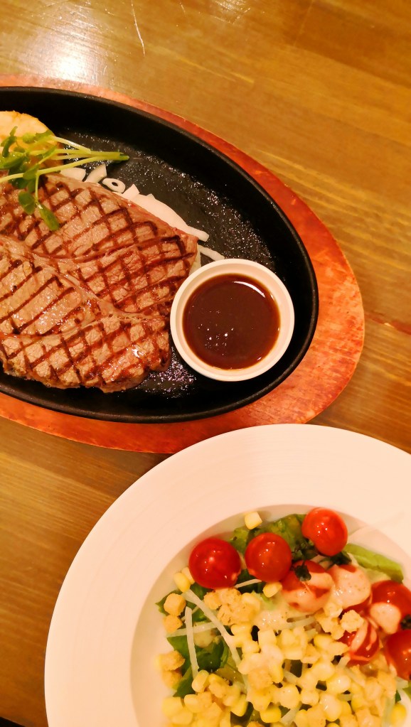 Japan is known for high-quality, luxurious Wagyu beef, but beef is generally good there even when it doesn’t cost an arm and a leg. Toward the end of my trip, I wanted to have a nice sit-down meal without going too far from the hotel. I was exploring the stores in the Moriguchi Station and came across a restaurant called Beco. They advertised a steak meal for ¥1,518.