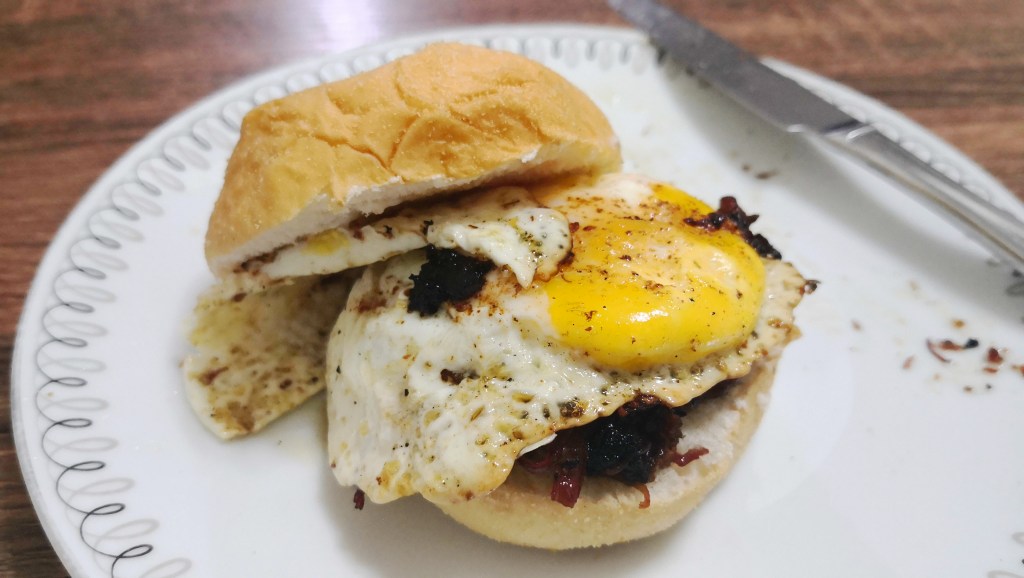 Being home all the time forces you to get creative with leftovers so you don’t feel like you’ve eaten the same food for the past three meals. I made the sandwich on the left with leftover corned beef. I heated it up in a pan, threw in some extra onions, lined the inside of some pandesal with mayonnaise, and stacked it onto the bottom bun. Then I put a fried egg with a little cayenne pepper on top. On the right is a bowl of leftover adobo pasta that I made. I shredded the pork and chicken from the adobo and used the soup as a kind of oil-based sauce. Lastly, I garnished it with some crunchy fried garlic.