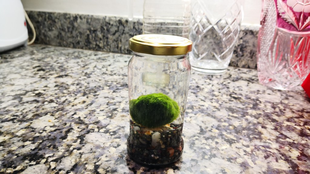 I first came across Mariimo Co on Instagram. At that point, I already had one moss ball for which I threw together a kind of DIY enclosure from an old pasta sauce jar and some rocks. What caught my eye was their pretty setups, complete with substrate along the bottom. They even sold little lights to stick to the inside of the lid!