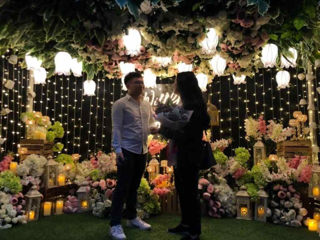 I walked up to the sitting area and it was decked out in flowers, candles, fairy lights, and lanterns. One of the neon lights spelled out “Will You Marry Me?”. And in the middle of it all was EJ.