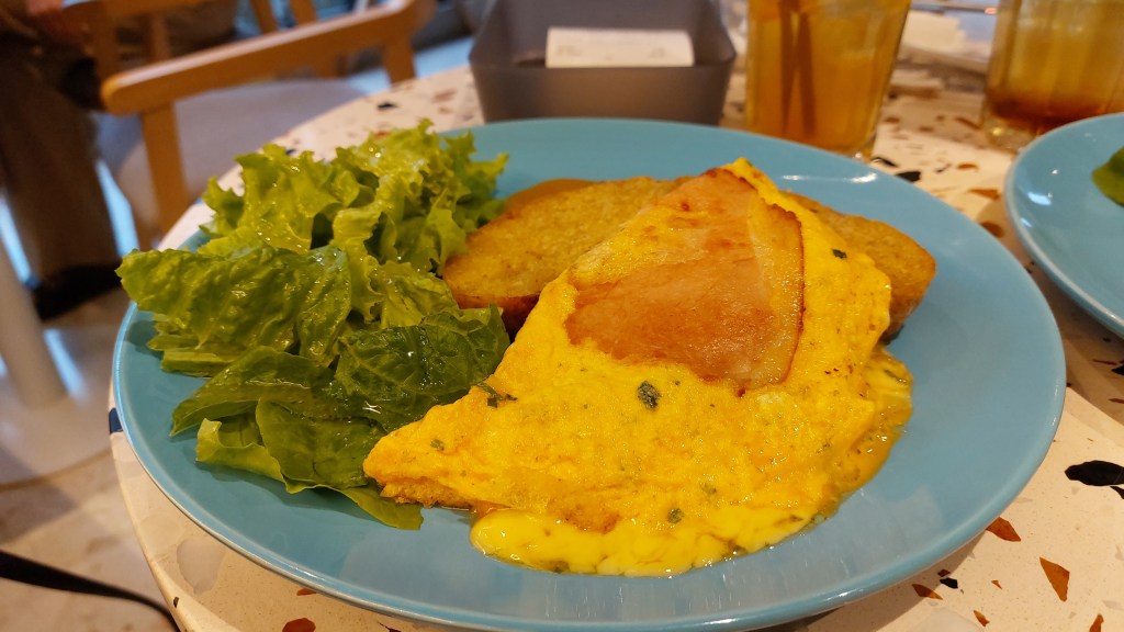 They have a nice variety of menu items, but most of them are brunch dishes. We ordered eggs Benedict and a cheese, bacon, and ham omelette with a side of toast. My omelette came with a simple salad, as well. One very important thing to note when you’re getting breakfast or brunch here: Cafe Leche bakes their own bread, and it does not disappoint!