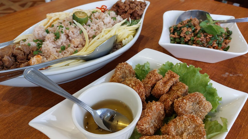 Another must-try dish at Som Tam is their khao kluk kapi, or bagoong rice. This flavorful ensemble strikes a delightful balance between sweet and salty, with fragrant shrimp paste-infused rice accompanied by tender pork, crisp string beans, tangy julienned green mango, and thinly sliced scrambled egg. The presentation is pretty, but you’ll have to mess it up to fully enjoy the food. Mix it all together well to make sure you get a little of everything for a perfect first bite.