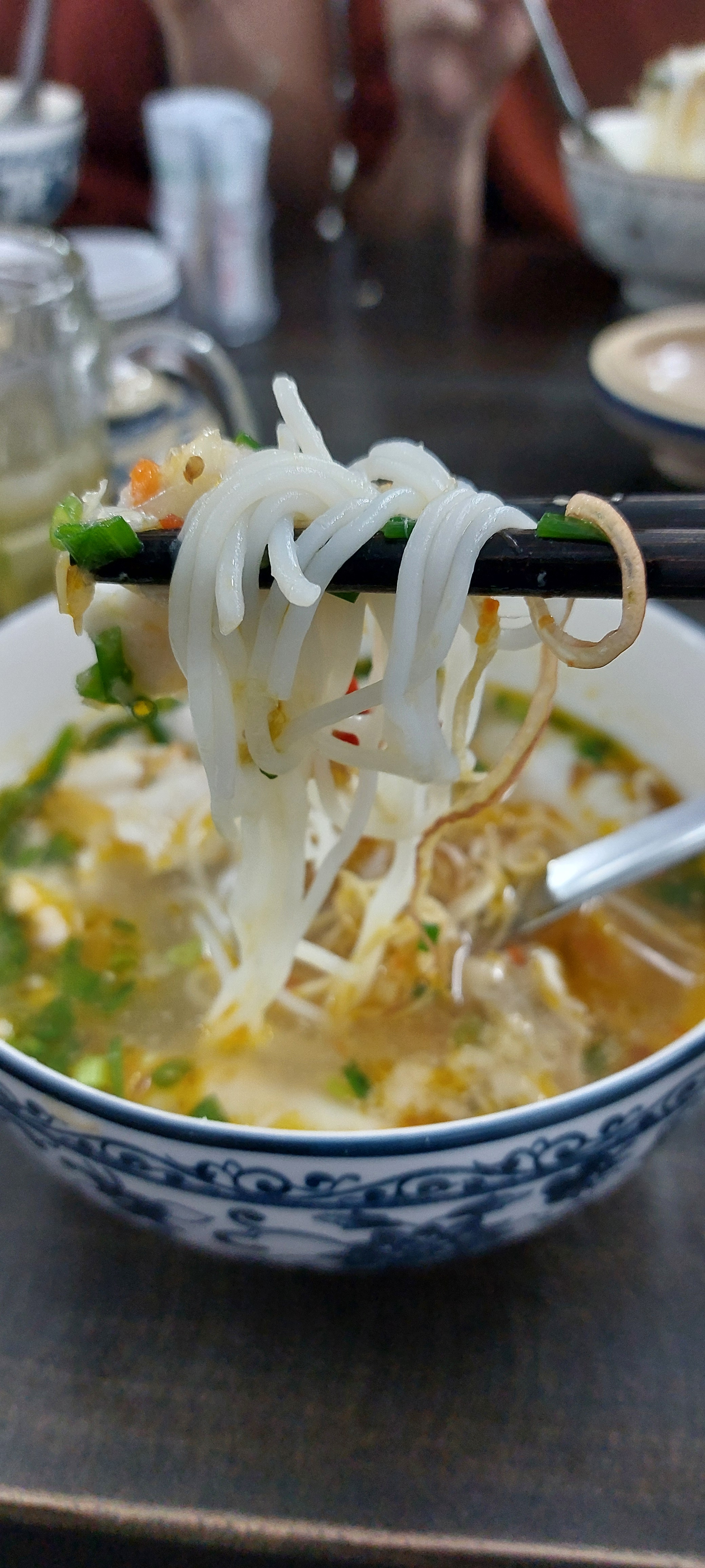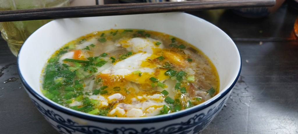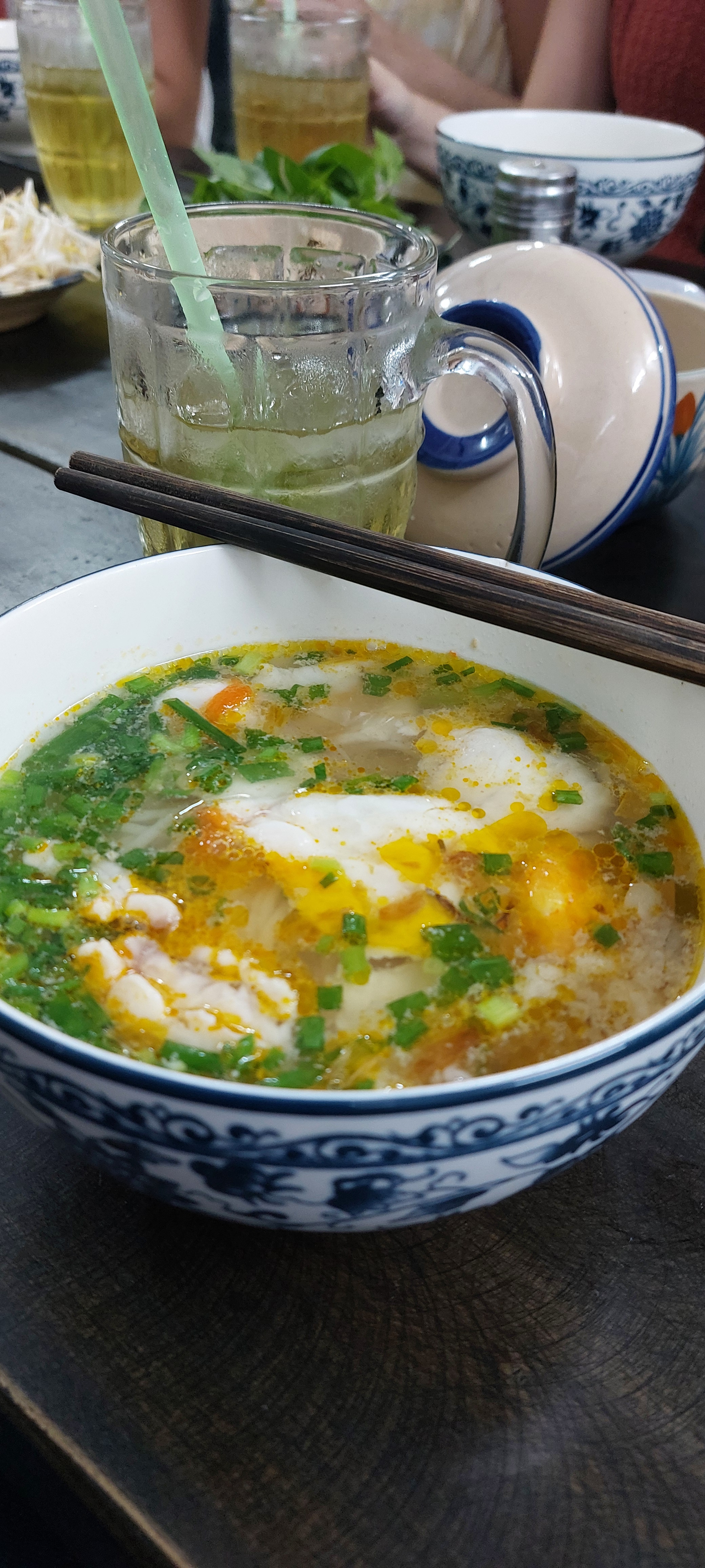 While pho is likely the most widely known Vietnamese broth-based dish, they have a variety of savory, comforting soups. The first thing we were served was fish noodle soup (bún cá kiên giang), which one of our tour guides, Jenni, said is a hit even with guests who aren’t big fans of fish. We dug into chewy noodles, aromatic broth, and tender pieces of fish. I loved the crunchy surprise of some long, thinly sliced onions mixed in with the shallots.