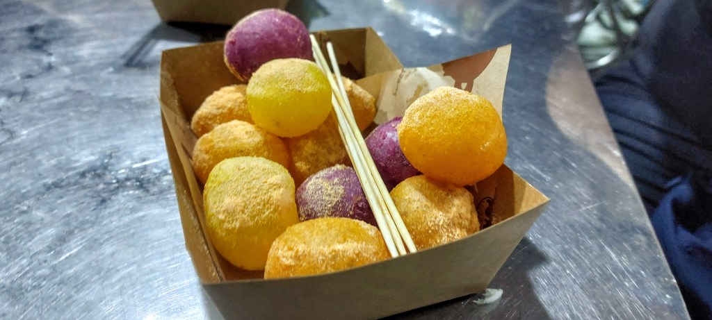 These sweet potato balls, khoai lang bong bóng, are hollow on the inside and dusted with artificial cheese powder. They are aptly called “balloons.”