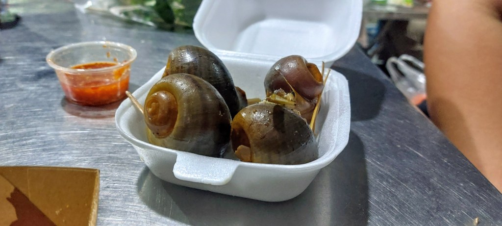 Another hint of French influence, these snails are a popular street food. French escargot is made with land snails; ốc nhồi thịt uses sea snails. We tried a version mixed with minced pork and wrapped in lemongrass. You use the ends of the lemongrass to remove it from the shell.