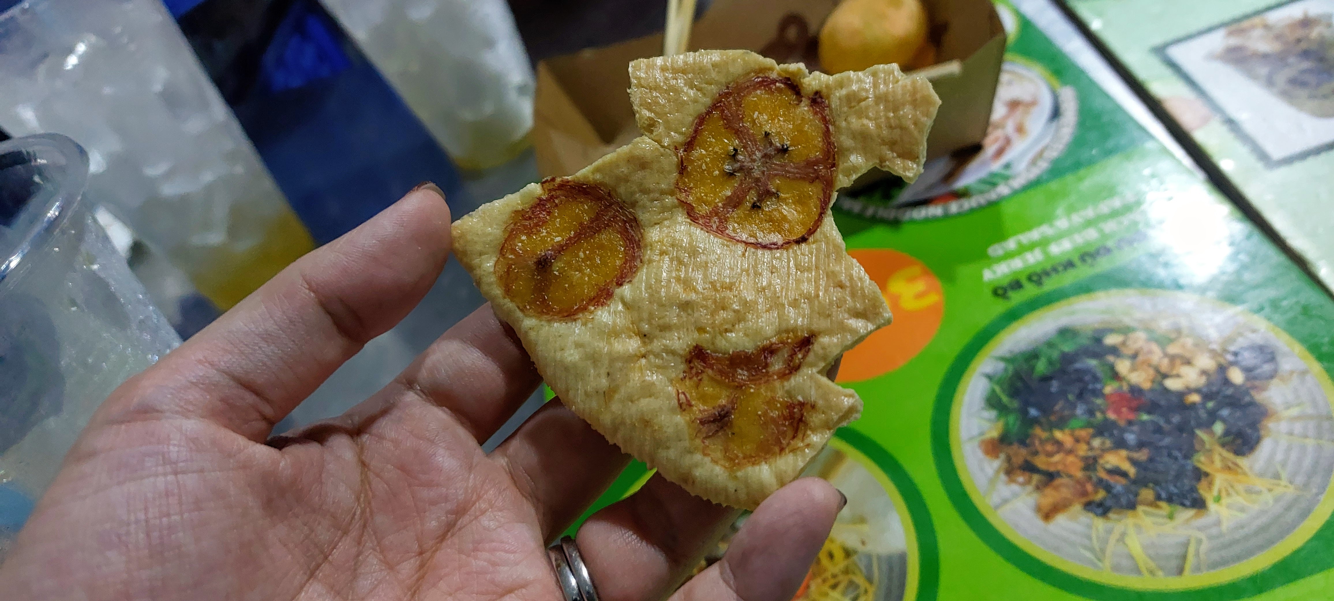 At our second stop, we sat down for a sampling of street food. Rice crackers are used in some snacks, like Vietnamese pizza, or eaten alone. A sweet alternative is the rice cracker with banana. It’s easy to tell them apart – you can see the individual banana slices! We got a large piece and cracked it into smaller portions to share.