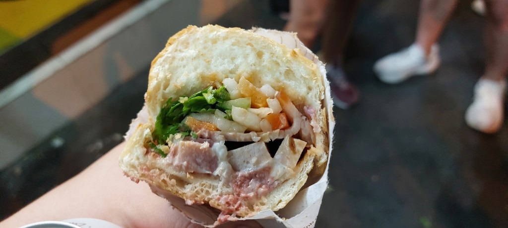 Typically, Filipinos don’t consider a sandwich a meal. (I learned this as a child, and my Japanese father, raised in the USA, was scandalized when I told him.) This is mainly because “real food” in the Philippines comes with a cup of rice – otherwise, it’s thought of as a snack. But this banh mi was as filling as some rice meals and had all the components that, in my opinion, make up a “real” meal: carbs, meat, vegetables, and happiness. We walked to the next stop while chowing down on our sandwiches, some of us drinking beer to wash it down. (Eating and drinking alcohol while walking around in public! Another thing my Japanese father would probably disapprove of.)