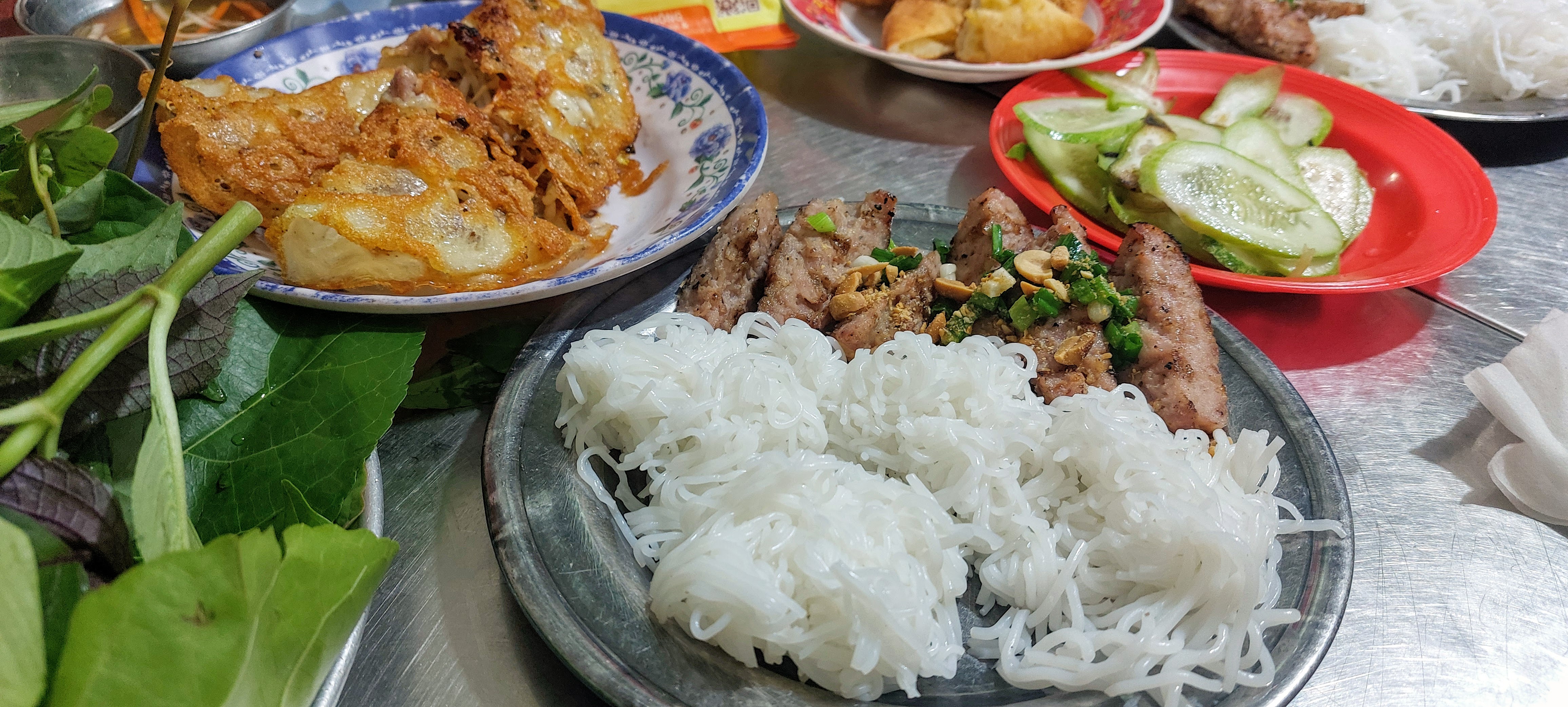 Here, we learned how savory pancakes (bánh xèo) are made and got a rundown of some Vietnamese herbs before assembling everything into rolls.