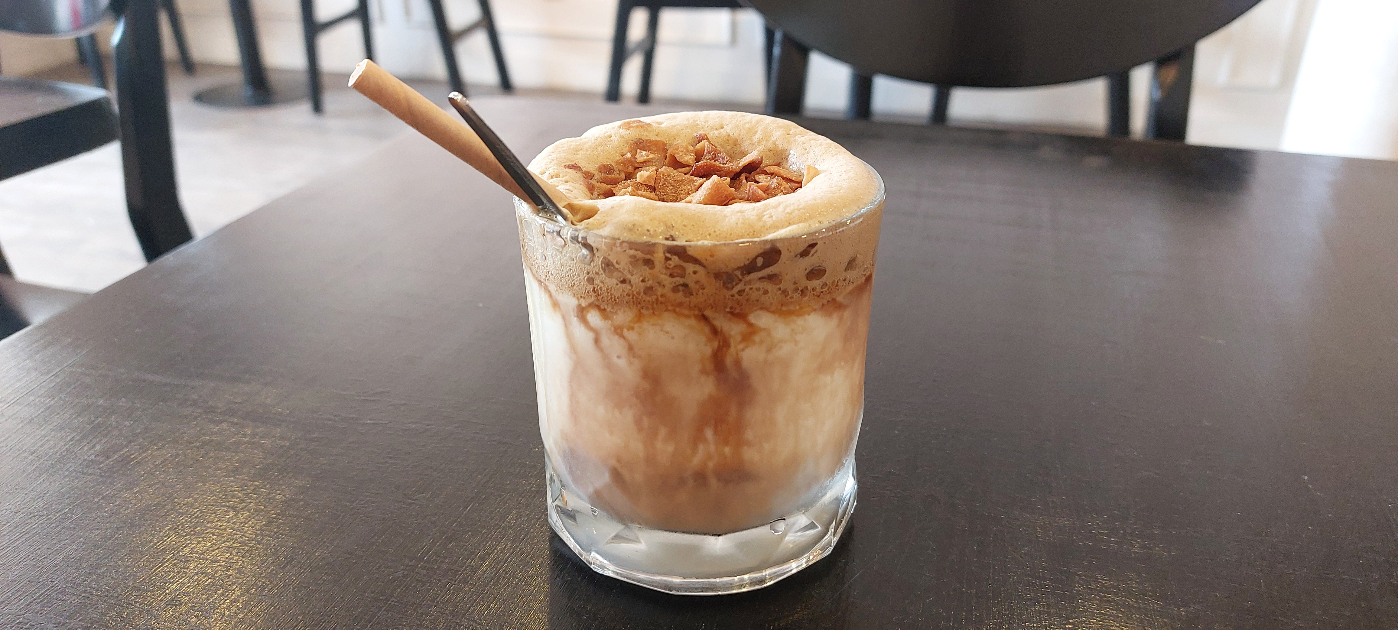 I ended up at 21 Grams, which is also a vegetarian restaurant. Although the view from the balcony seating was tempting, I opted to sit inside and avoid the afternoon heat. I ordered their Vietnamese coconut coffee. They serve it iced, with some delightful toasted coconut flakes on top. I am happy to report that it was easy on my low caffeine tolerance! I think of it as a “dessert” coffee, but the sweetness is well-balanced.