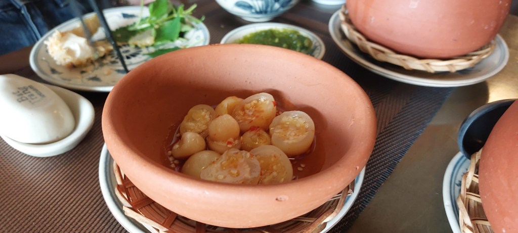 I love pickled vegetables and will eat them whenever they’re available, but this side dish was something new to me. The eggplants were so tiny they looked like pale cherry tomatoes. Another first for me – white eggplants! They were tart and crunchy.